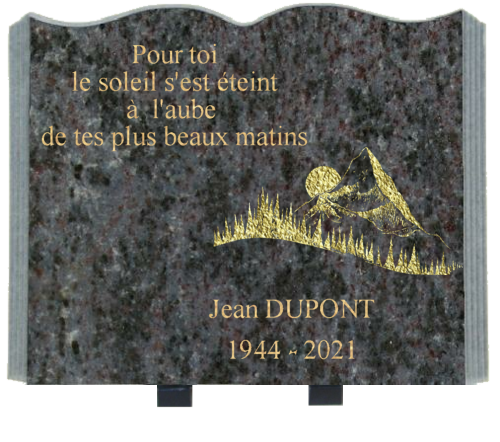 Plaque Livre 30x40, granit magnetic blue, avec gravure motif soleil montagne, et texte identité du défunt, et texte personnalisable sur une page