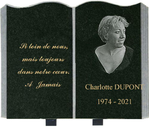 Livre 30x23 granit kinawa, sur socle granit avec gravures bronze et texte identité du défunt,