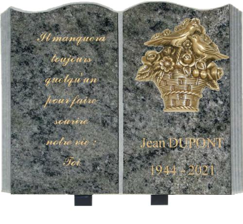 plaque forme Livre 30x40, granit vert, avec bronze veritable oiseau et fleurs, et texte identité du défunt, et texte personnalisable sur une page